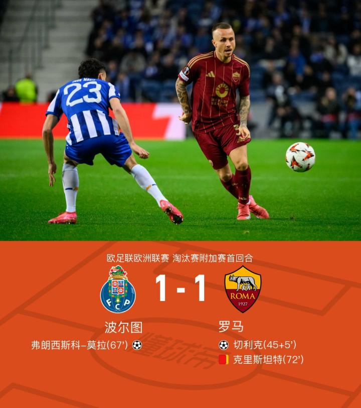 在比赛进行到第45+5分钟时,最终打破僵局的时刻到来了!切利克在禁区内跟进,成功将球捅射入网,为罗马队取得了领先。场上的球迷们爆发出了热烈的欢呼声,球员们也在庆祝着这个重要的进球。但是,这个进球并没有让波尔图队就此认输,他们开始加强进攻,希望能够扳平比分。